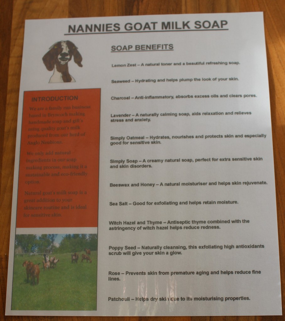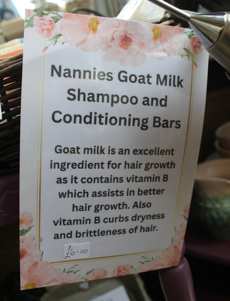 £6Shampoo and Conditioning Bar – £6£6 a BarBath Bombs – £4.50 each£4 – Soap£5 SoapGift Sets between £10 and £20Nannies Goat Milk Soap, bath bombs and gift sets made with milk from their own goats