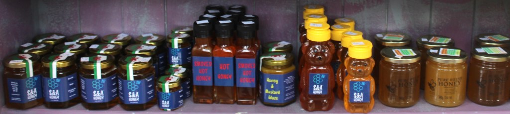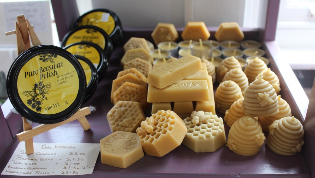 Sleeping Giant Honey – £9 for 340g£6 & £3£6£9, £6 and £3£4 Hot Honey & Smoky Hot Honey£4S&A HoneySkep Beehive Candles – £3Furniture Polish – £6.70Beeswax Blocks – £1.50Tealights – £1Pure beeswax – £1.50Beeswax Products by Jeff Booth and his Bees